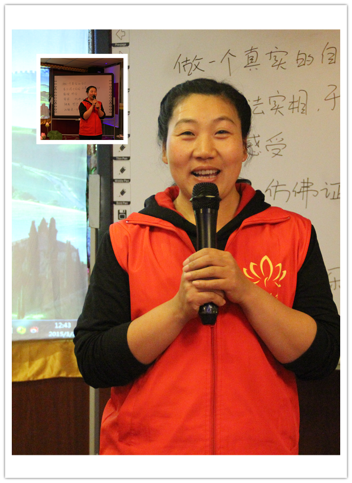 她分享到自己以前在家里是享受型的人物,让她干活就生气,但那时的自己两眼无神,迷茫消极。通过几年来的参学,她明白了学佛要把人生这本烂账给算清楚,趁着现在还有人身,能还帐的赶紧还帐,能尽孝的赶紧尽孝,能积德的赶紧积德。这时虽然她肯于去做了但还是属于被动的听老师的话,而不是主动的发自内心的欢喜的去干家务。黄师兄接着又反省自己缺少感恩心,当她意识到这一点,再刷碗的时候,虽然很累,但她想到每一滴水都对自己有恩,每一个碗都对自己有恩,没有它自己就没法吃饭。丈夫也对自己有恩,支撑起这个家不容易,还把劳力布施的机会给了自己。她进一步想到马老师所说:“学佛就是全心全意为人民服务,就是毫不利己专门利人。”这时她找到了人生的意义和价值。心一旦有力量了,有使命感了,就会在家主动欢喜地干活,在道场也会主动的发自内心地去做义工。她体会到付出的无所求的快乐是真乐。