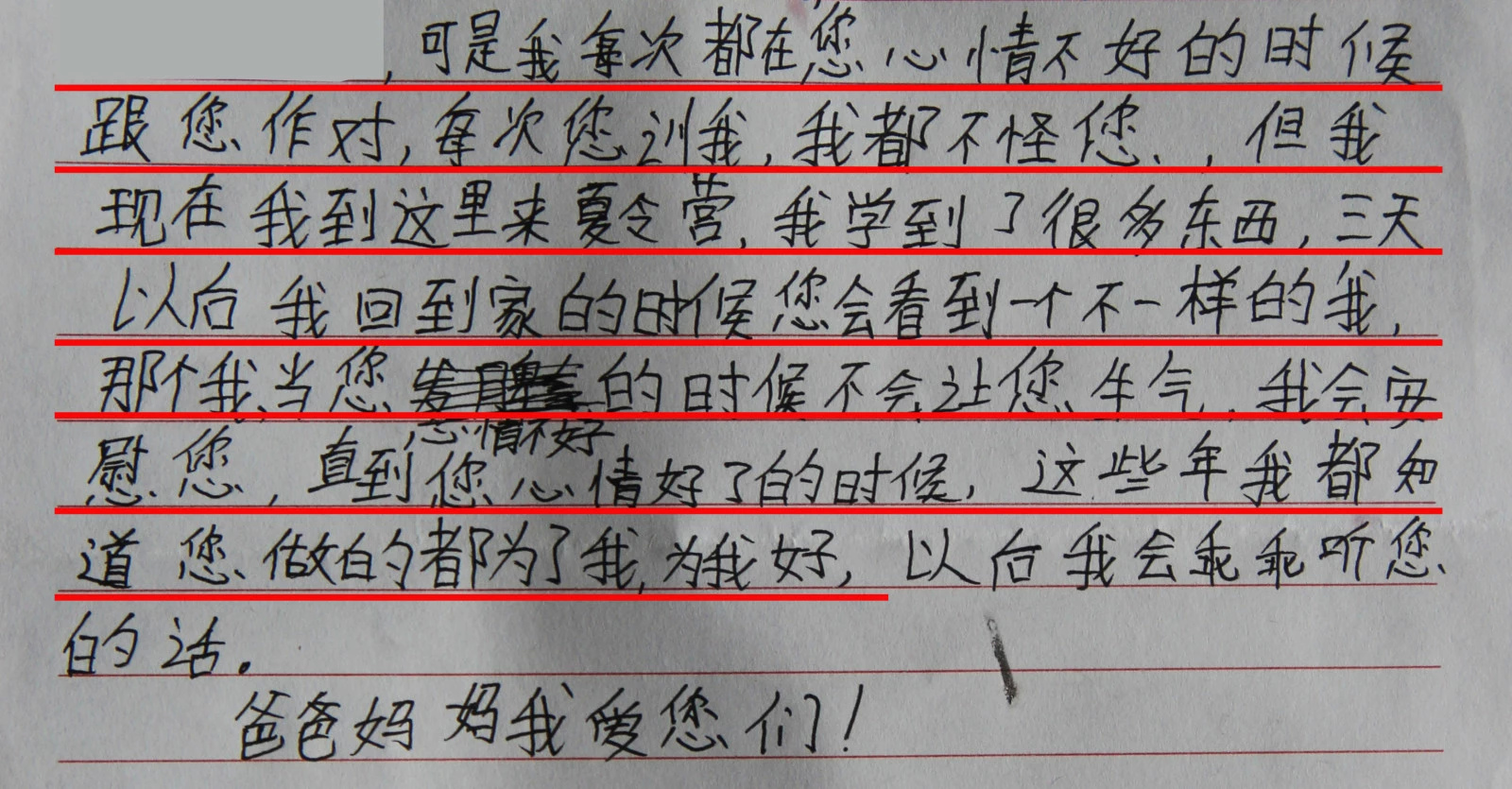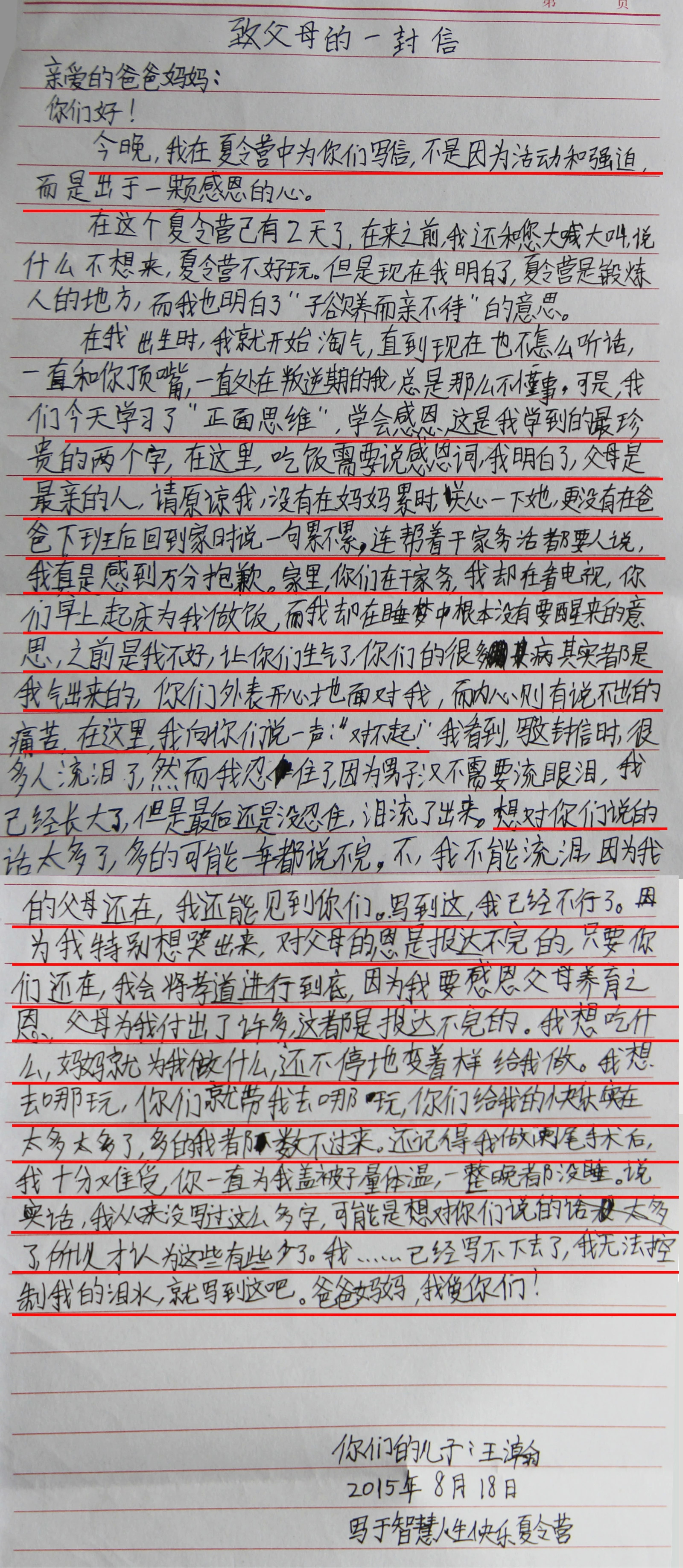 在黑龙江虎林仁德教育学校举办的智慧人生快乐夏令营第二天,孩子们纷纷给父母写了一封感恩的信。