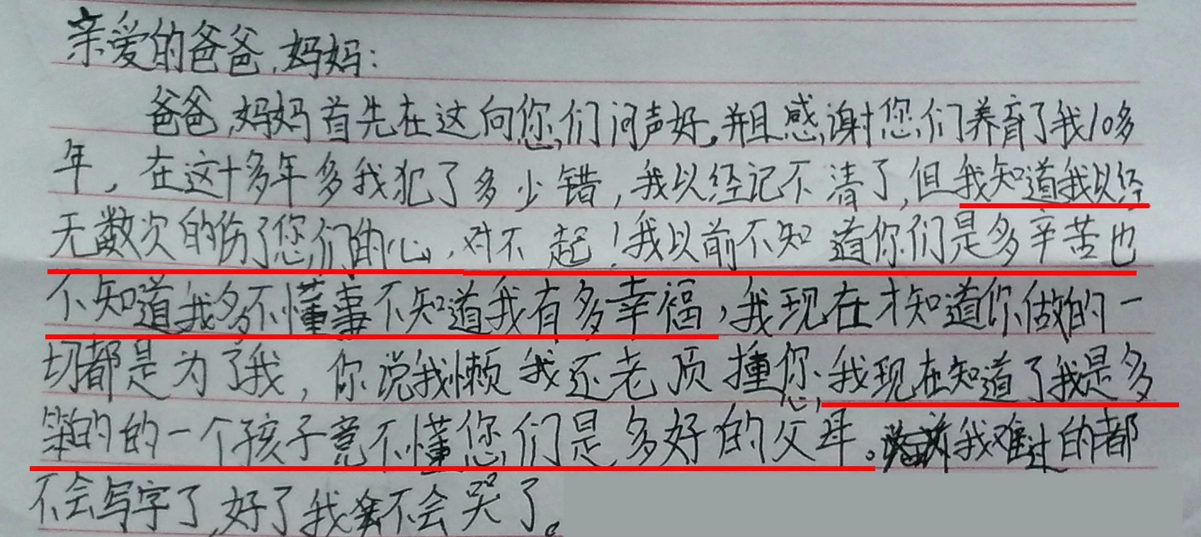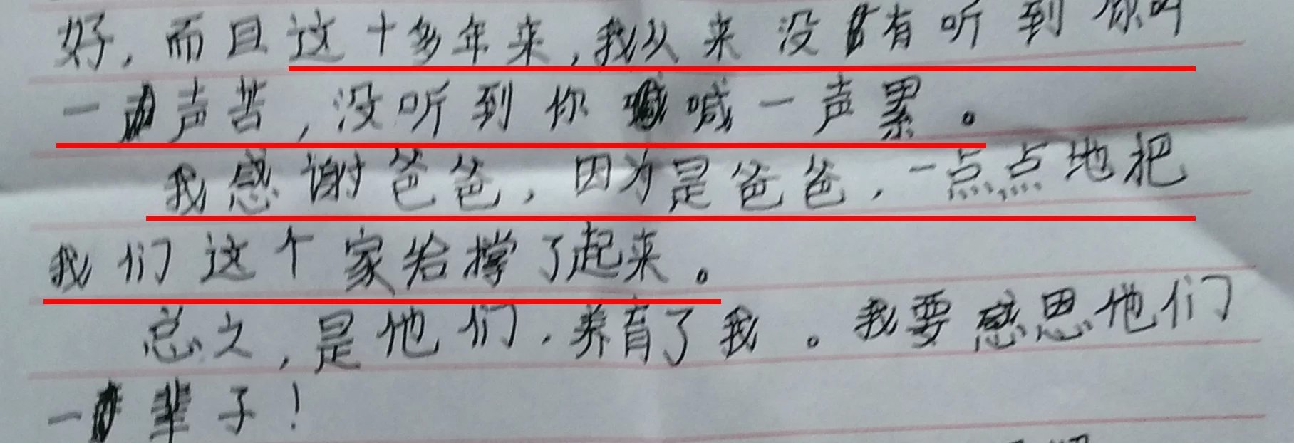 孩子们在十几岁的年龄,开始体谅父母,开始感恩父母,开始反省自己的不孝,开始感受到父爱如山母爱如海带来的温暖,这些孩子们是幸福的、是幸运的、是有福气的。