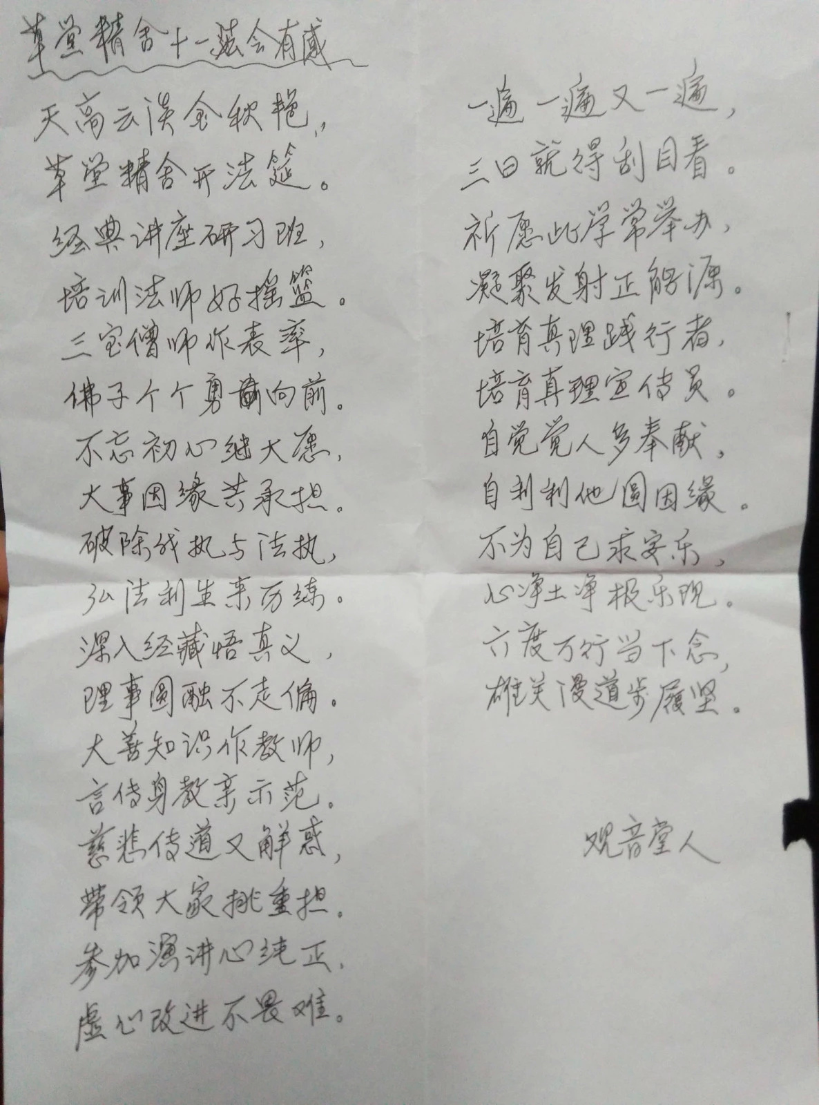 我们十位师兄住在一个寝室,观音堂人(吴老师)最有学问和智慧,她对我们几位演讲的师兄帮助很大。总是耐心的给我们讲解经典。不管谁问什么,什么时间问,她都会放下自己的事情,把马老师的讲解细化给我们听,只要我们听就是十一、二点了她也不休息,师兄说吴老师在家也是这样忙到深夜的。70多岁的老人家有这样的精力,让我心生惭愧,是我的愿力心不够呀!发心好好学习,克服懒惰的毛病。无锡的佘师兄指导我用自己的感悟去讲解,她激励我弄不明白就别睡觉,有这决心就行。她管我叫妹,我管她叫姐。她是一个直言不讳的姐姐,总能激发我的灵感。
