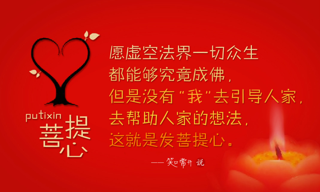 答:这个要先明白什么是菩提心?佛言:菩提心者,是一切诸佛的种子,只有菩提心,才能生长出觉悟的佛法。菩提心者,是大地良田,能够提供万物生长所要要的净法。菩提心者,好比纯净的清水,可以洗涤一切众生烦恼污垢;菩提心者,好比行空的烈风,不会被任何的障碍所阻挡!菩提心者,好比猛盛烈火,能够燃烧掉一切邪知邪见。菩提心者,好比光芒万丈的太阳,为万物苍生的生长提供光明和温暖。菩提心者,好比十五的明月,本来就明亮而圆满。
