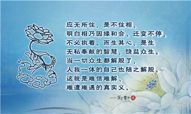 应无所住,是不住相,明白相乃因缘和合、迁变不停,不必执着。而生其心,是生无私奉献的智慧,饶益众生。当一切众生都解脱了,人我一体的自己也随之解脱。这就是难信难解、难遭难遇的真实义。