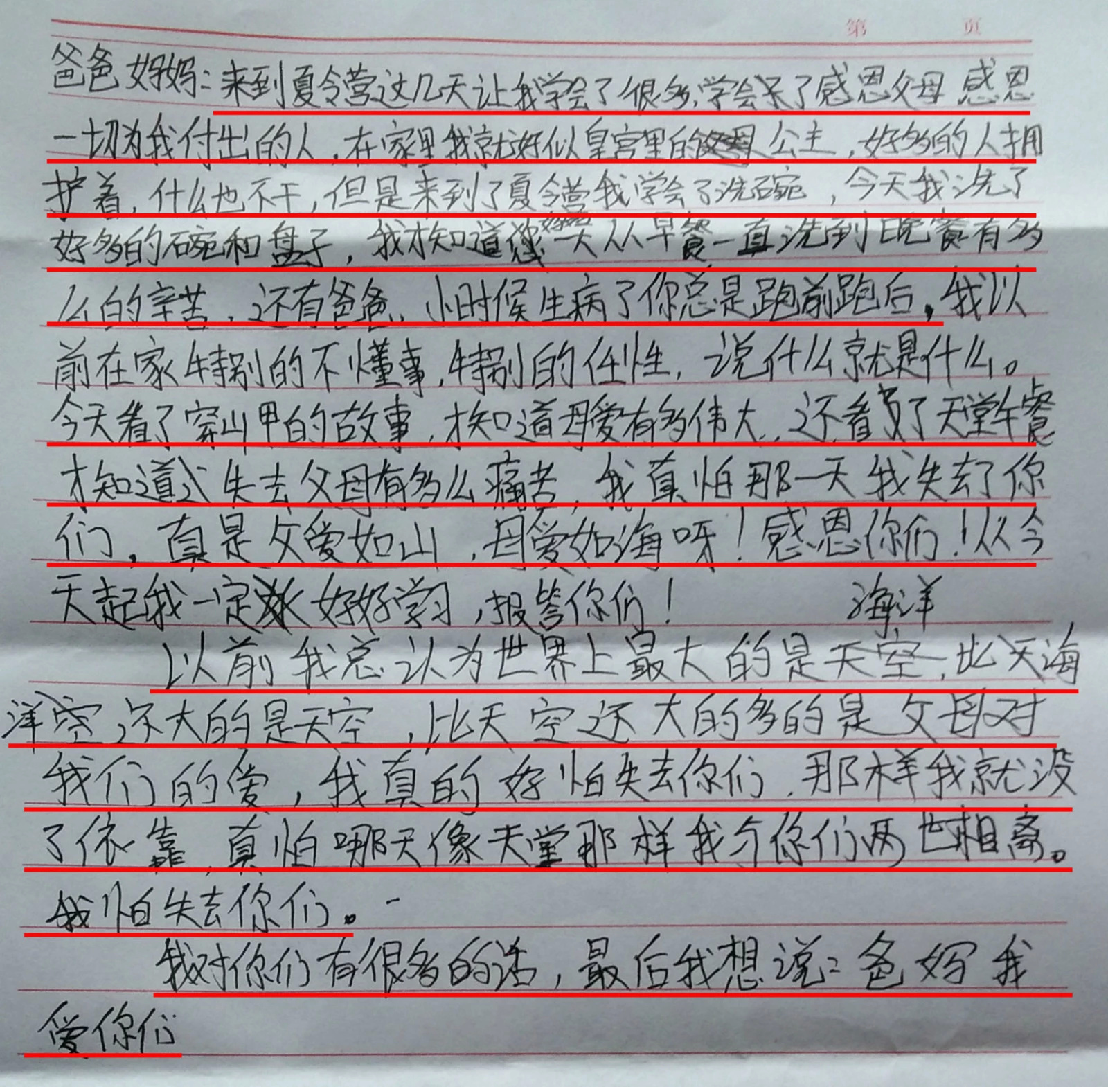 2015年8月,在黑龙江虎林仁德教育学校举办的智慧人生快乐夏令营第二天,孩子们纷纷给父母写了一封感恩的信。在整理这些信件时,我的眼泪和孩子们的眼泪汇聚在一起,我们感恩父母的心相会在一起。每个人内心深处对父母的爱,对父母的歉疚都相似。