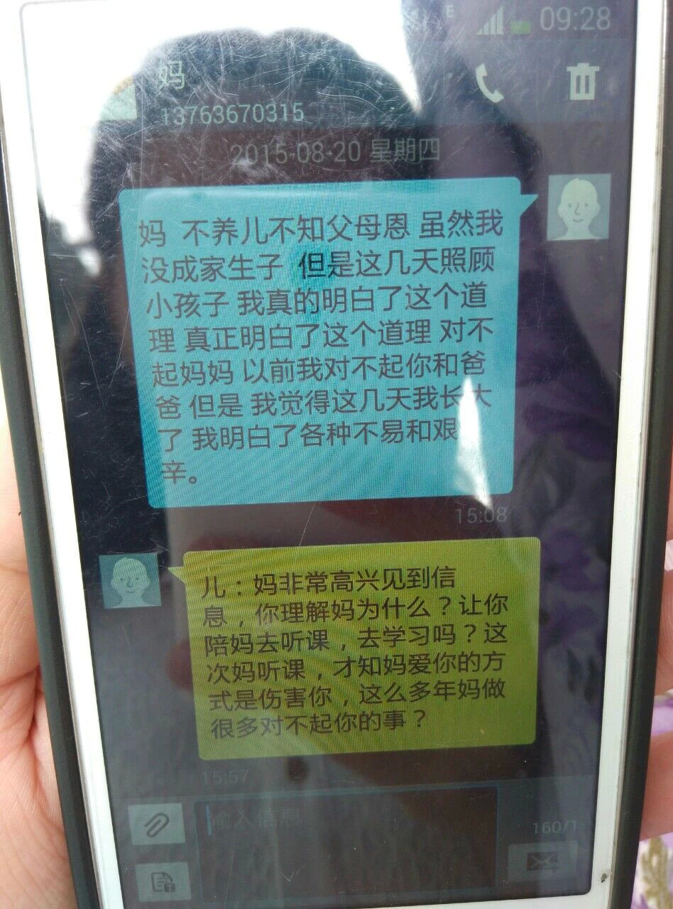 《不养儿不知父母恩》,这位同学18岁,在夏令营中当义工,通过照顾更小的同学而有了以下的一番感慨。上面是他发给妈妈的短信,下面是妈妈的回话。这位妈妈听了许老师给夏令营家长的一堂课《和孩子共同成长》,反省到自己爱孩子的方式是在伤害孩子。这段对话好感人,可想而知,有多少家庭因此而更加和谐、幸福。